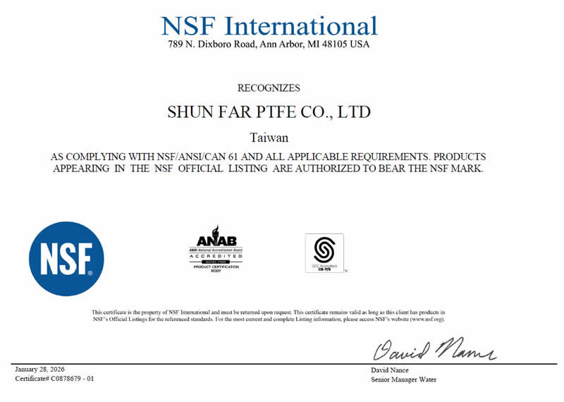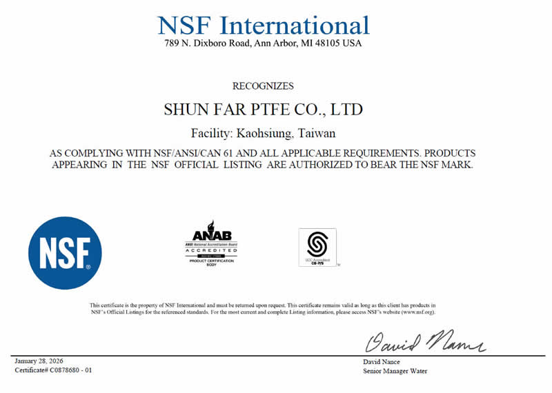 附件為我們的 NSF 證書。若您有計畫爭取美國訂單,或正準備進行產品認證,歡迎找我們聊聊!我們能提供具備認證的材料樣品供您先行測試。